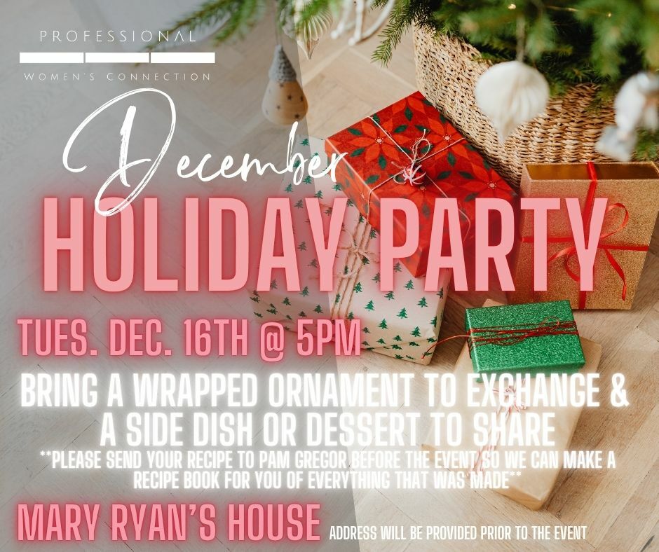 Join PWC for our annual holiday party! Event will be hosted at Mary Ryan's house (address to be provided prior to event). Please bring a wrapped, unlabeled, ornament to participate in an ornament gift exchange. And please bring your favorite appetizer or dessert dish to pass. We will be collecting the recipes from everyone and providing them to you in a book to keep.
